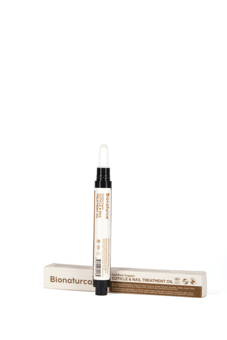 BIONATURCA Organik Sertifikalı Tırnak ve Tırnak Eti Bakım Yağı(Certified Organic Cuticle & Nail Treatment Oil), shea butter, argan, hindistan cevizi, çay ağacı ve tatlı badem yağı gibi bitkisel içeriklerle tırnak ve tırnak çevresine derinlemesine bakım sunar. Kuruyan, çatlayan ve sertleşen tırnak etlerini yumuşatır, tırnakları besleyip güçlendirir. Bu bitkisel tırnak eti bakım yağı, tırnaklarınıza doğal bir dokunuş katar.