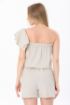 Kum beji renkli, tek omuz dekolteli, diğer omuz volanlı, beli lastik büzgülü ve ip bağlamalı, duble paçalı, şile bezi, mini tulum. Bütün ürünler terzimiz tarafından %100 bitkisel kökenli kumaşlardan evde, özenle biçilip dikilmiştir.