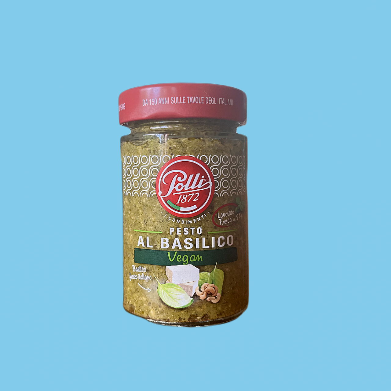 İçindekiler: Fesleğen %38,8, ayçiçek yağı, patates, su, tofu %8(su, soya fasulyesi, magnezyum klorür), kaju %6, yulaf lifi, tuz, patates nişastası, Asitlik düzenleyiciler; laktik asit ve askorbik asit, şarap sirkesi, Antioksidan; askorbik asit, besbase, karabiber.