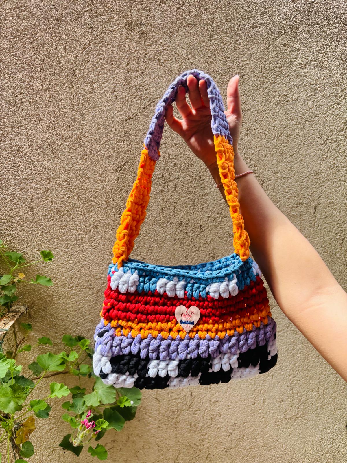 Altındaki capcanlı dama deseni, şehrin hareketini fısıldarken; üstteki bulut gibi örgüler, mavi, beyaz ve turuncunun dansıyla ufuk çizgisine uzanıyor.